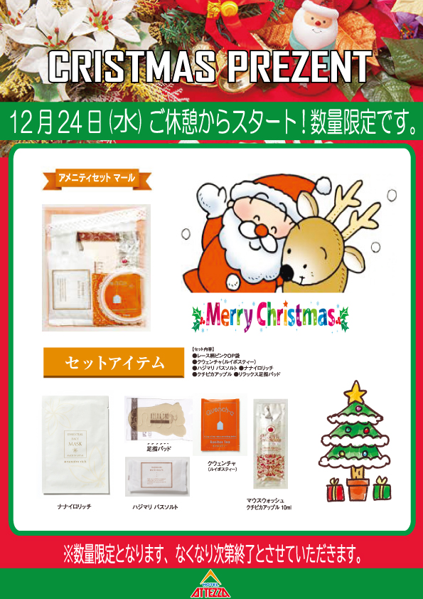 12月24日より、クリスマスプレゼント配布いたします 日頃のご愛顧に感謝の気持ちを込めて、ご来店の方にプレゼントいたします。 12/24(水)休憩から、「アメニティセット マール」を、ご来店のお客様に数量限定でプレゼントいたします。 なくなり次第終了となります。